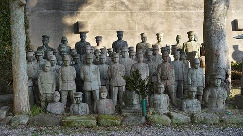南知多町の軍人墓地に行ってきました。浅野祥雲作品のコンクリート石像シリーズです。 写真から雰囲気を感じ取っていただけると思いますが、ここの石像は、五色園や桃太郎神社などのユーモラスな雰囲気とは一線を画します。