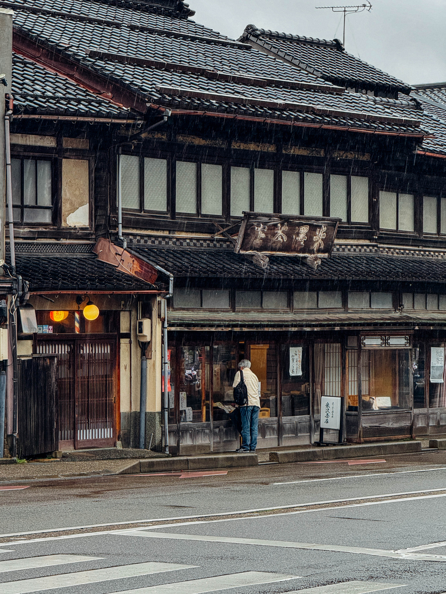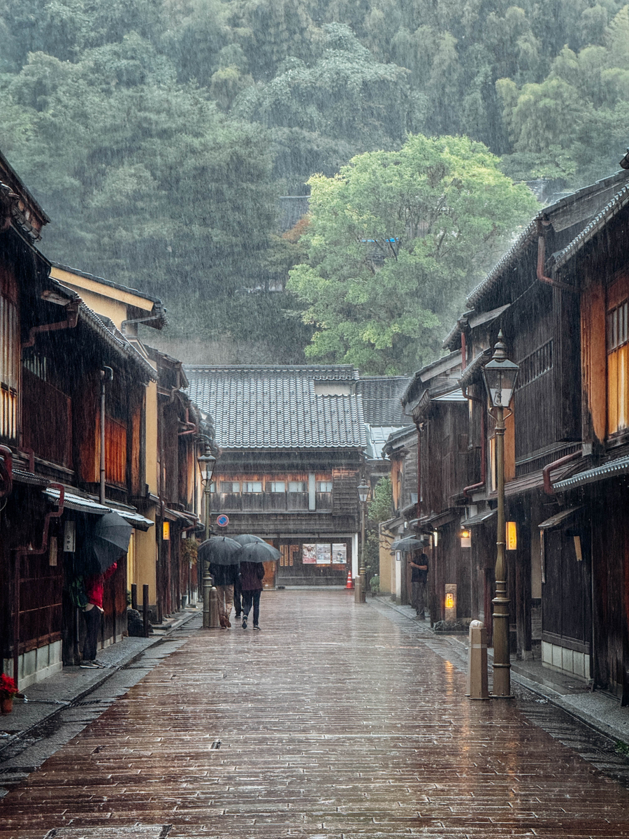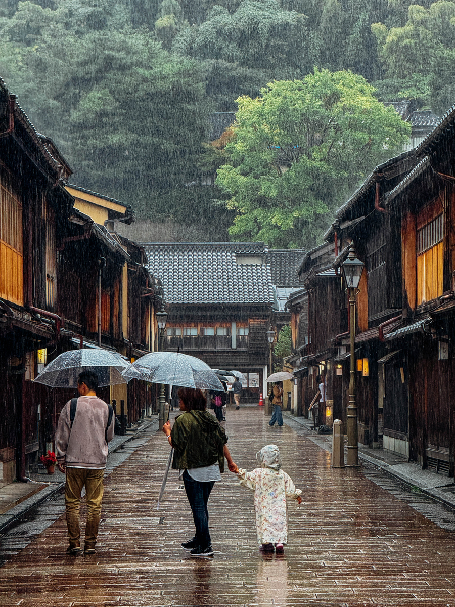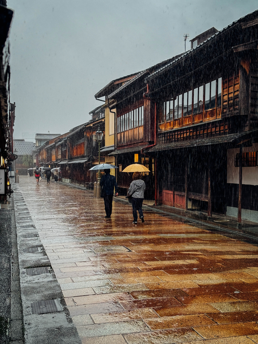 雨に濡れた街並みは、どこか幻想的で、普段とは異なるひがし茶屋街の魅力を引き出していました。ひっそりと佇む町家や、しっとりと落ち着いた雰囲気は、まるでタイムスリップしたかのような感覚に。