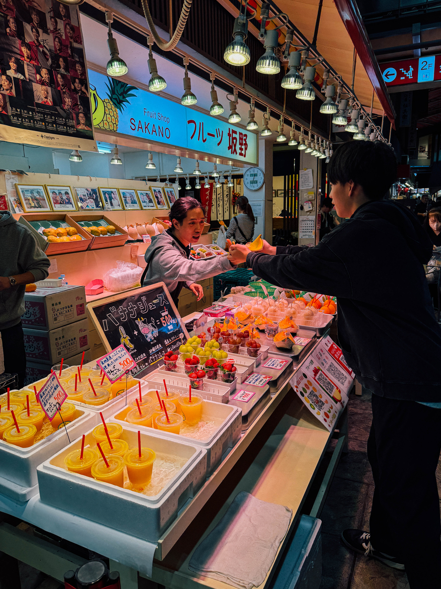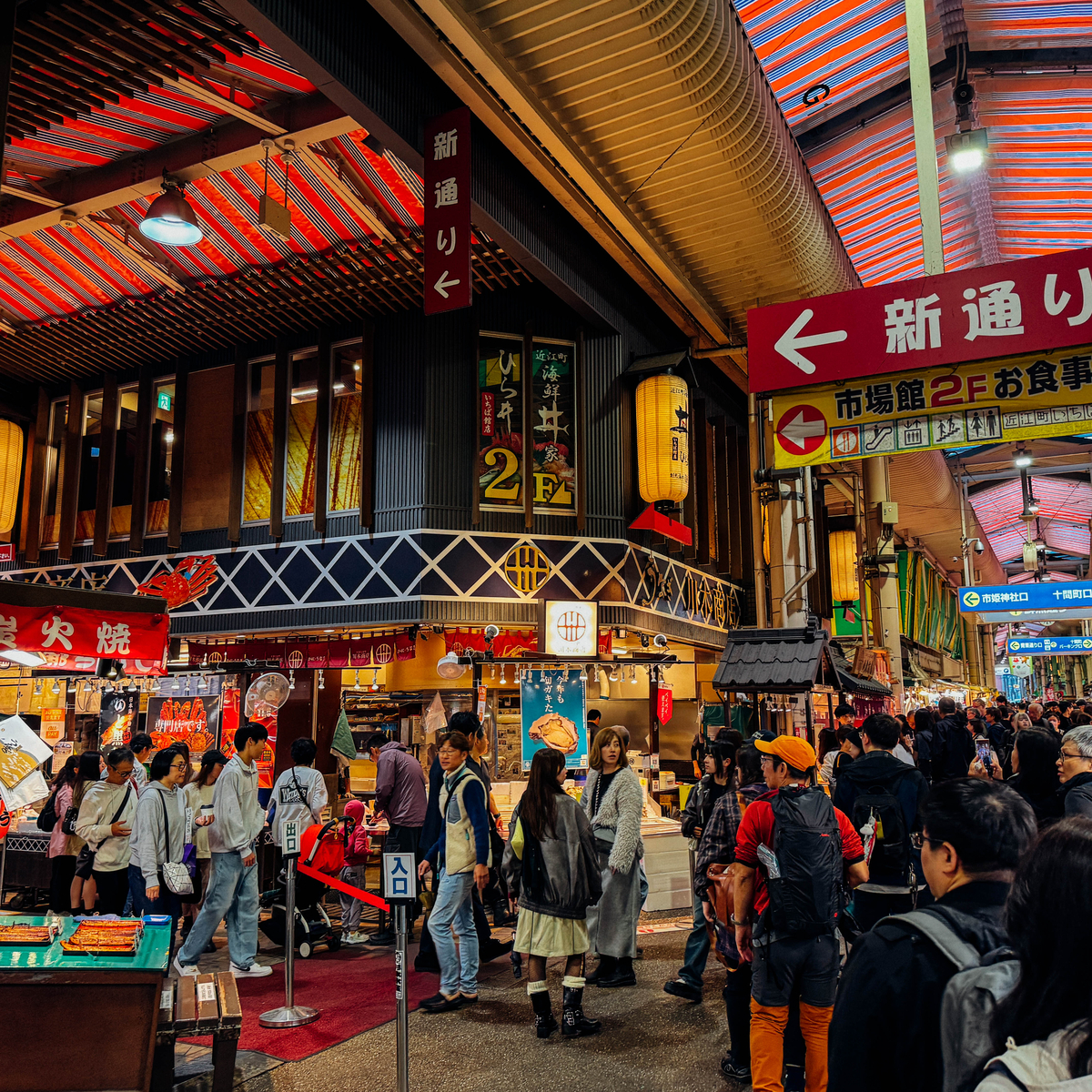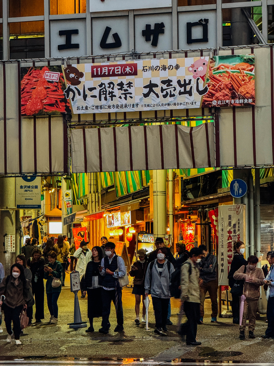 カラフルなアーケードが目を引く近江町市場は、活気にあふれていました。京都の錦市場よりも開放感があり、ゆったりと食べ歩きを楽しむことができました。