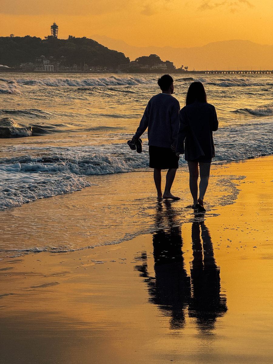 七里ヶ浜界隈の海岸線を歩くと、砂が鏡のように光を反射しているのをよく目にします。これがずっと不思議で、とても魅力的だと感じていました。少し調べてみたところ、この現象は、「砂浜が濡れて滑らかな水膜ができること」「砂が細かく均一であること」「適切な光の入射角度」といった複数の要因が重なって起こるものだそうです。この辺りの砂は本当にサラサラしているので、それも美しい反射を生み出す一因なのでしょう。