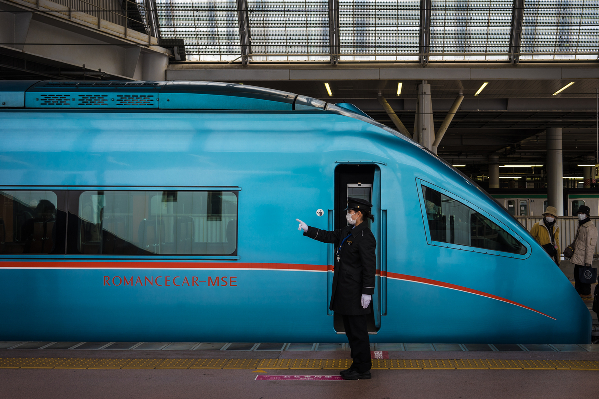 鮮やかな色の特急列車。出発を待つ運転士の背中から、旅の始まりの高揚感をお裾分けしてもらった気分でした。