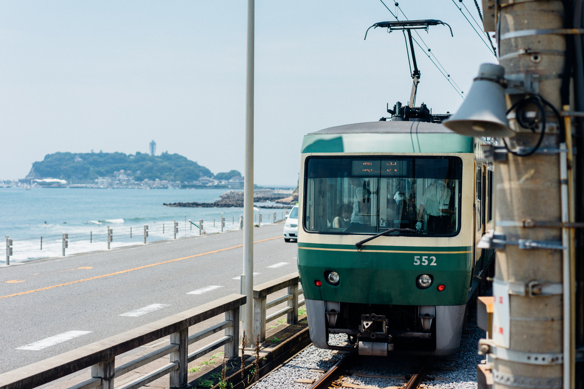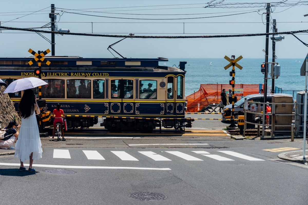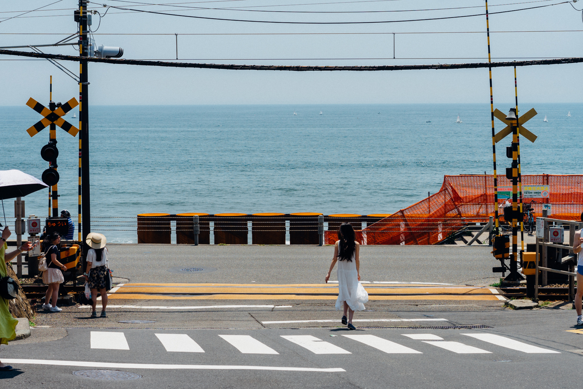 踏切の向こうに広がる青い海。世界中の人がこの景色に恋をする理由が、ファインダーを覗くとよくわかります。眩しすぎる光のなかで、波の音と電車の音が重なる瞬間。