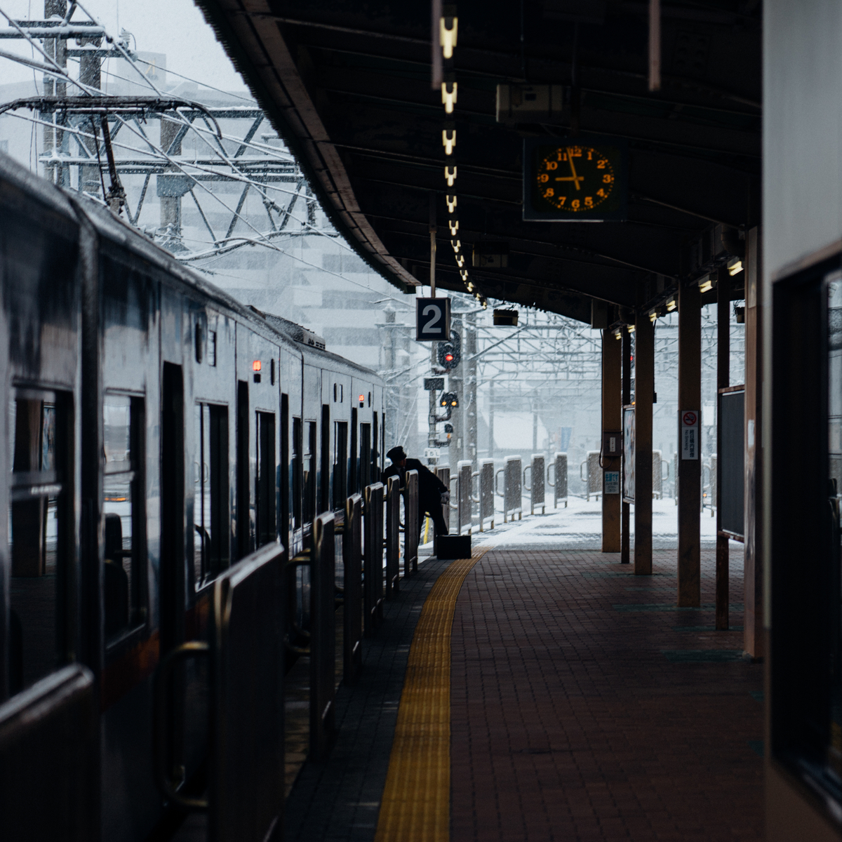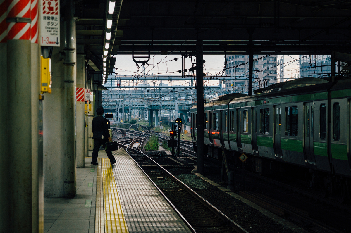 都会の喧騒のなか、一瞬だけ訪れる静寂。ホームに滑り込む電車の質感が、都会の朝を象徴しているようでした。