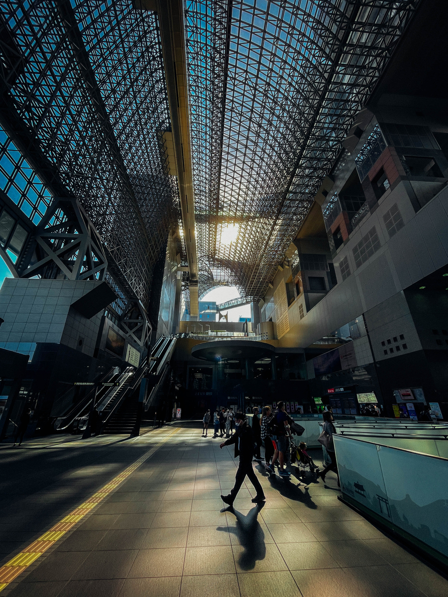 巨大な吹き抜けを見上げると、吸い込まれそうな空が見える。現代的な構造物の隙間から、京都という街の誇りが透けて見えるようでした。