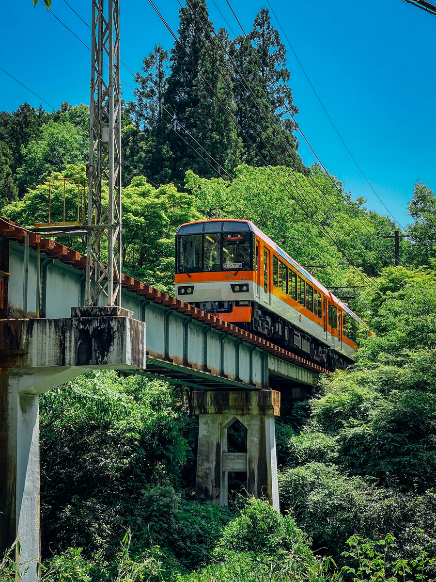 山あいにひっそりと佇む駅。初夏の青もみじ、あるいは秋の紅葉。季節が色を深めるたび、オレンジ色の車両が緑のトンネルを抜けてくるのを、つい待ってしまいます。