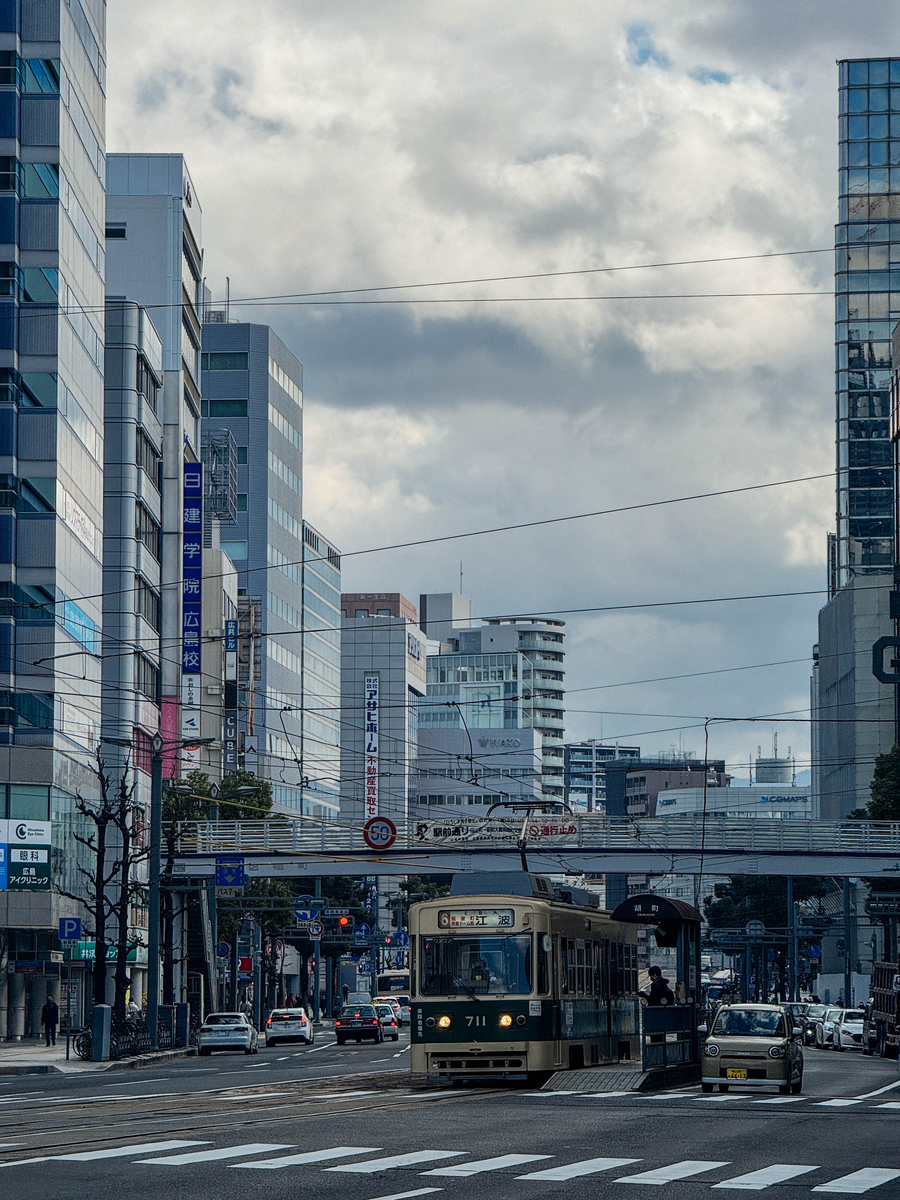 ビル群のあいだを抜けてくる路面電車。街のなかに、当たり前のように電車がいる風景は、何度見ても飽きることがありません。